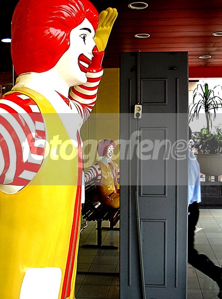 Seorang customer Mc Donald harus melalui detektor logam untuk masuk dan menikmati makan siang, sementara 2 patung mascot Mc D menyambut dengan senyum. Pengamanan ketat diadakan karena krisis perang AS-Iraq.