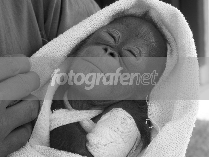 Bayi orangutan ini terpaksa berpisah dengan induknya dan harus dirawat intensif di klinik Pusat Reintroduksi Orangutan Nyaru Menteng Palangkaraya Kalimantan Tengah karena tangannya mengalami patah tulang akibat perjuangan menyelamatkan diri dari kejaran manusia. Bayi umur dua bulan ini berhasil diselamatkan Yayasan Balikpapan Orangutan Survival (BOS) Kalimantan Tengah bersama 14 orangutan lainnya (empat diantaranya bayi). Hanya dalam waktu enam hari, pekan lalu enam ekor orangutan diselamatkan BOS dari ancaman pembunuhan karena mereka dianggap hama bagi kebun sawit. Kini di Nyaru Menteng ada 217 ekor orangutan yang diselamatkan, 56 ekor diantaranya bayi dan itu berarti 56 ekor induknya telah dibunuh. Sebagian besar diselamatkan dari kekejaman pembukaan perkebunan kelapa sawit, pembukaan kebun kelapa sawit di Kalteng itu hingga kini masih berlangsung. Hanya dalam waktu 7 tahun saja 10.000 ekor orangutan musnah dari Kalteng karena kebakaran hutan dan konversi perkebunan besar-besaran. Sori ceritaya panjang soalnya emang dah keterlaluan tuh konversi perkebunan. Kamera diset otomatis ke mode Best Shot Selector (BSS). Bagusnya colour apa BW kaya gini ya?