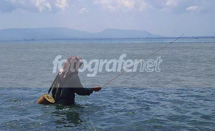 Motretnya terpaksa nyebur juga kelaut, basah sebatas pinggang, sorenya masuk angin trus diomeli istri.rnSayang warna baju si pemancing sewarna dengan laut, maunya sich disuruh ganti dulu, hehehe.