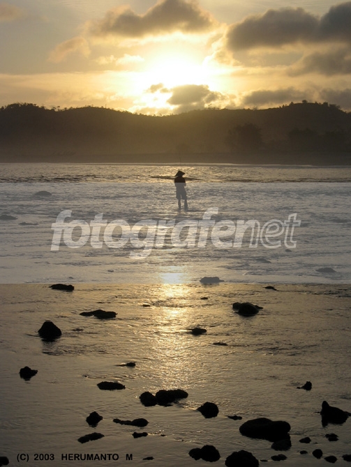 Senja sudah semakin miring di pantai tatkala seorang nelayan masih berusaha keras mengail ikan dibagian yang dangkal....Tempat berdirinya nelayan ini cukup jauh ke tengah lautan,zoom tidak berani maksimal takut goyang dan sekaligus utk memperlihatkan situasi laut disekitarnyaOlah PS:adjust contrast,resize image.