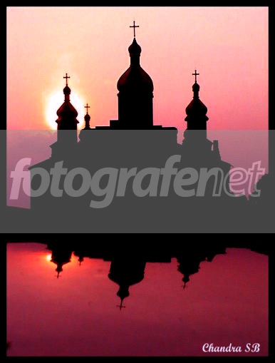 Diambil saat sunset. Saya ambil diseberang jalan depan gereja dengan digicam saya. Refleksi dari atap mobil van saya.. jadi agak melengkung. rnWarna dipoles dengan PS supaya lebih menarik. Mas Irwansyah.. itu bukan bayangan diair.. tapi diatap mobil jadi miringrn