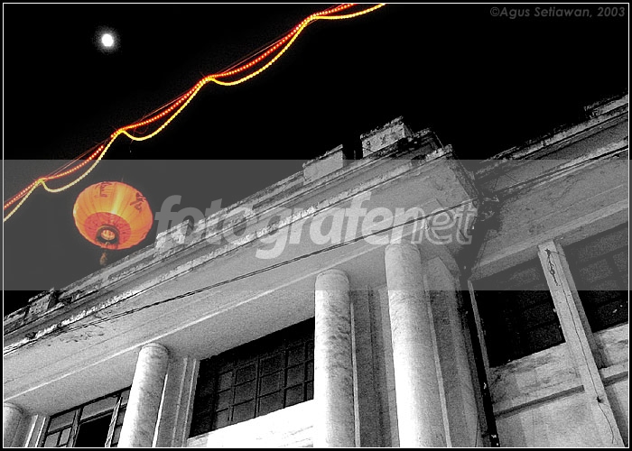 Salah satu sudut Kya-Kya Kembang Jepun (KKKJ) di Surabaya.rnKKKJ adalah jalan raya Kembang Jepun yang ditutup pada malam hari dan dijadikan pusat jajan kaki lima, mirim konsep malioboro jogja, tapi disini jalannya bener2 ditutup dan orang makan di tengah jalan.rnKebanyakan pengunjung adalah rekan2 chinese, karena disini tersedia aneka macam chinese food, tapi jangan salah, disini juga tersedia makanan tradisional indonesia, seperti pecel, nasi liwet, nasi krawu dsb dsb.rnSepanjang jalan digantungin lampion2 seperti pada foto diatas, kesannya bener2 seperti china town.rnBeberapa bangunan tua masih berdiri di sepanjang kiri kanan jalan, salah satunya yang saya potret ini.rnBuletan kiri atas adalah bulan. Edit in PS.