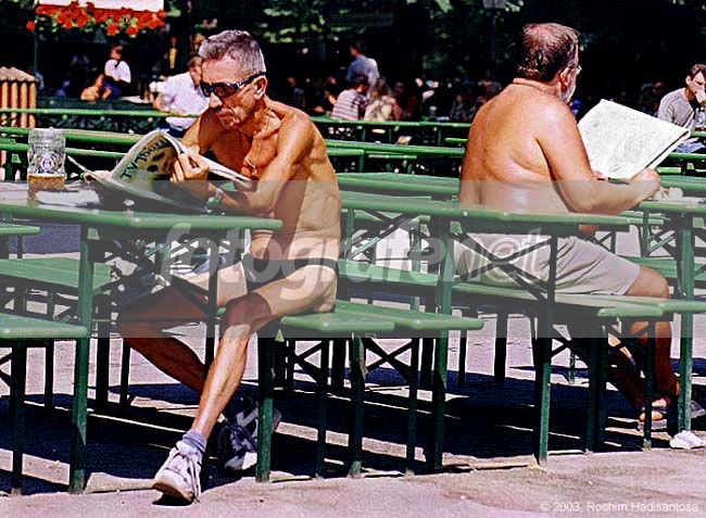 Saat Minggu 17 Agustus lalu bersama Suryo, Alex dan Wijaya main ke Bier Garten di Englischer Garten, nggak menyangka kalau di tempat yang sama ketemu lagi dng orang yg sama dengan yang pernah ku jadikan obyek foto dan telah kuupload bulan Juni lalu, yaitu pada foto Sunny Sunday, Newspaper, and A Glass of Beer. rnKali ini 'Anak Muda Ganteng' ini pun masih tetap dengan kebiasaannya yang sama, duduk dengan segelas besar bir, hanya bercelana, berkacamata sport, dan tengah membaca koran, tapi bila dulu masih bercelana pendek, kali ini ia hanya ber'celana renang' saja, dengan potongan rambut lebih pendek, dan 'ditemani' si Gendut di belakangnya. rnSuryo, kesalahan hari telah diperbaiki. :)