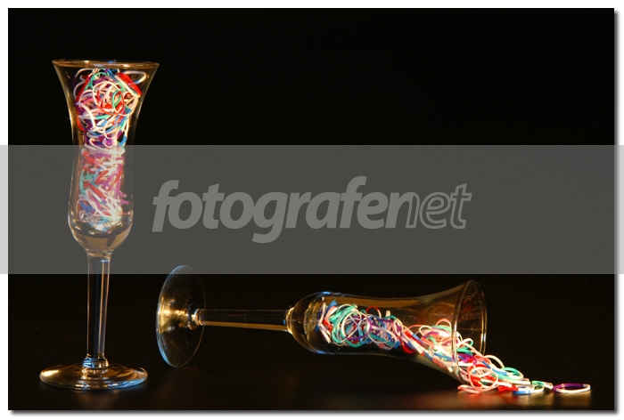 Lagi eksperimen dengan lampu pijar. Gelas diisi dengan karet gelang untuk ikat rambut. Lampu dari arah kanan, BG layar hitam. Tanpa flash.