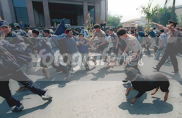 foto yang bagus,lihat komandan polisi itu dengan kedua tangannya ngasih komando,dan ekpresi yg demo.cuma kurang jelas demo apa ya?