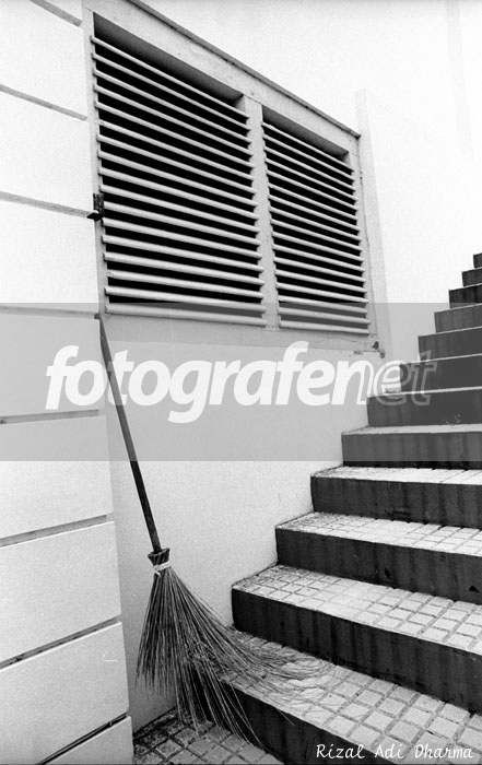 Komposisinya bagus, dan enak diliat. Foto ini unik, semua elementnya berpola sama: stripes (jendela, tangga, lantai tangga, dinding dan sapu lidi).