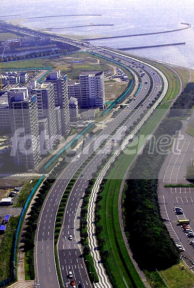 Makuhari Beachroad diambil dari lantai 50 sebuah gedung. Cuaca agak berkabut, dgn olah PS ini hasil yang paling bersih (kemampuan saya). Kawasan ini 20 th yang lalu adalah laut. Reklamasi dilakukan untuk membuat suatu kawasan bisnis satelit untuk kota Tokyo yang sudah terlalu padat. Makuhari terkenal sebagai 'new business district' dengan gedung eksibisi terbesar di Jepang: Makuhari Messe (tempat Tokyo Motor Show diselengarakan). Terletak sekitar 30 menit (by car/train) dari pusat kota Tokyo.