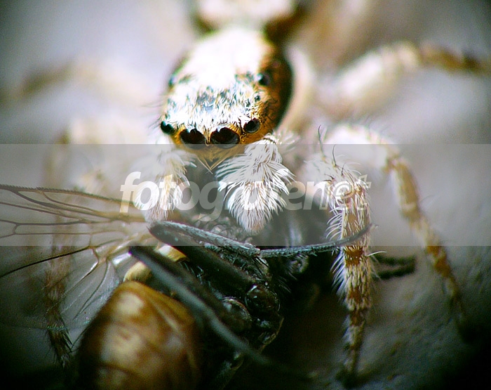 Seekor lalat sedang diterkam laba2 yg ukuran fisiknya lebih kecil.rnDi depan lensa Leica ditambahkan lensa Minolta 75-300mm yg dibalik dg dipegang tangan.rnUjung lensa diganjal jari yg nempel langsung dg lantai supaya tdk goyang pada 1/50 detik.rnFocal length = 316mm.rnImage stabilizer On.rnDOFnya sudah tak bisa lebih lebar lagi soalnya kalau dg diafragma terkecil 8 kecepatannya menjadi 1/6.25 detik, apalagi kamera yg sy pakai tak bisa manual (full auto).rnDan tak bisa pakai flash karena jarak obyek ke lensa kurang dari 5 cm.rnFocusnya juga dengan cara memajukan atau memundurkan lensa karena hanya bisa focus pada daerah tertentu.rnBelum lagi laba2nya lari2 terus, susah sekali menggiringnya, sampai akhirnya mangsanya dilepas dan laba2 kabur. :(rn