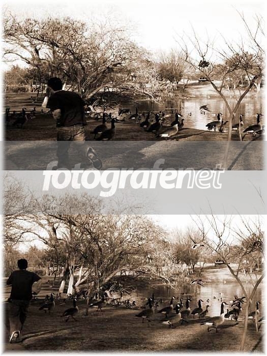 Teman saya yang mencoba takut2in sekelompok geese ini biar saya bisa mengambil foto mereka sedang berlari atau terbang, tapi, ngga berhasil he.he.he..geese nya cuman geser dikit doang....rncuaca yang dingin...siapapun enggan pindah....rnrnanyways...still appreciate his effort though :D Foto asli berwarna, tapi langit tidak sebiru foto sebelumnya, padahal ambilnya bareng, jadi di bikin sephia saja. rnThanks buat saran dan kritiknya. Semoga berkenan.