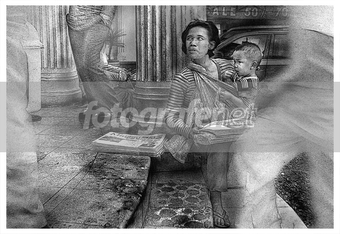 ini foto ibu penjual koran yang mangkal di emperan salah satu FO di Bandung , bayangan putih di kiri kanan itu pengunjung yang lagi lewat ..., kualitas foto aslinya 'ga gitu bagus -agak blur karena Low lighting .., jadi di touch di ps ajah..