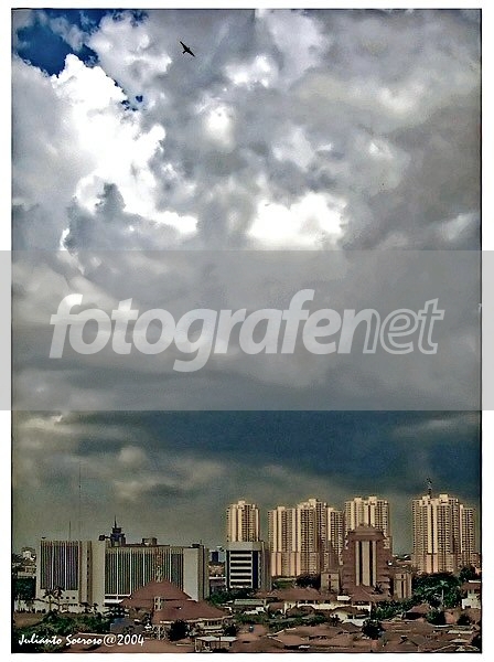 Bingung BIRD kalau lihat awan di jakarta rnJawabnya semua asli .. ini aku buat agak grainy ternyata masih kurang grainy ya hehehe . karena aku mau buat burung yang benar benar bingung di mendung itu ...burung ini memang kebetulan nyasar liwat di situ ..untung nggak baewa flu burung hehehehe.rnrnAwan mendung datang tiba tiba menggumpal aku gelapkan sedikit ternyata kayanya agak kotor ya hehehe .. aku suka awan aneh aneh ..kalau lihat awn mencekam seperti ini rasanya .......mau selimutan