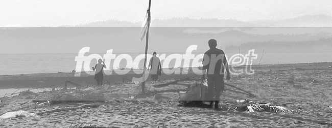 1 orang nelayan pulang dari menangkap ikan dan disambut oleh ke 2 temannya yang meminta bagian sedikit hasil tangkapannya karena keduanya tidak dapat melaut karena sakit. Foto diambil saat fajar dimana kabut masih menyelimuti darat dan pantai.