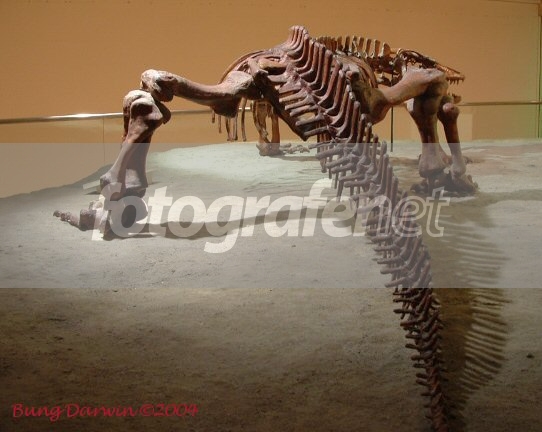 Salah satu kerangka tulang binatang purba. Sudut bidik dari belakang untuk menonjolkan pattern(pola) tulang ekor dan bayangan (shadow) yg jatuh ke samping kanan rnrnSelagi muda banyak makan rendang Badannya tegap tulangnya kokoh Selagi muda banyak begadang Badannya loyo tulangnya bengkok rnrn(Date Time Original: 2004:04:25 02:52:51rnISO Speed Ratings: 100)