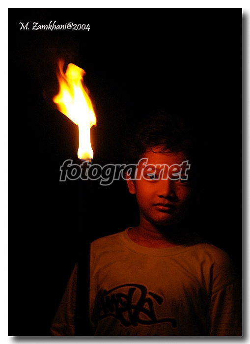 Good shot, tapi kurang dinamis imho... obornya statis, mungkin bisa minta si model utk menggerak2an obor, jd lebih terlihat bermain obornya. Here some tips..., coba pake fill flash yg ditutupi gel orange utk mimic warna orange obornya pada si anak agar terlihat lebih popped.