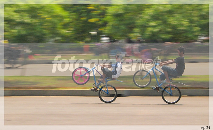 Date Time Original: 2004:12:19 10:32:17rnIseng2 jalan2 ke monas. banyak aktivitas anak2 di sana, salah satunya latihan akrobat sepeda. sembari belajar Panning, jeprat-jepret deh... wheelie artinya mengangkat roda depan sambil jalan.....rnmohon saran buat teknisnya, bagaimana membuat panning yg baik dan benar. :))rnMonggo dikomen...