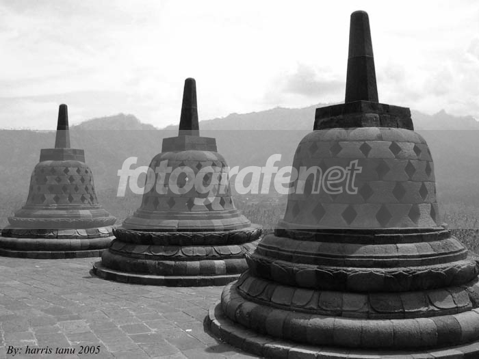 Komposisi OK ... Jadi BW juga OK ... Mungkin lebih bagus kalau ketiga stupa terjadi utuh. Cropping kebablasan atau ngambilnya memang kemepetan? Salam Jozzz