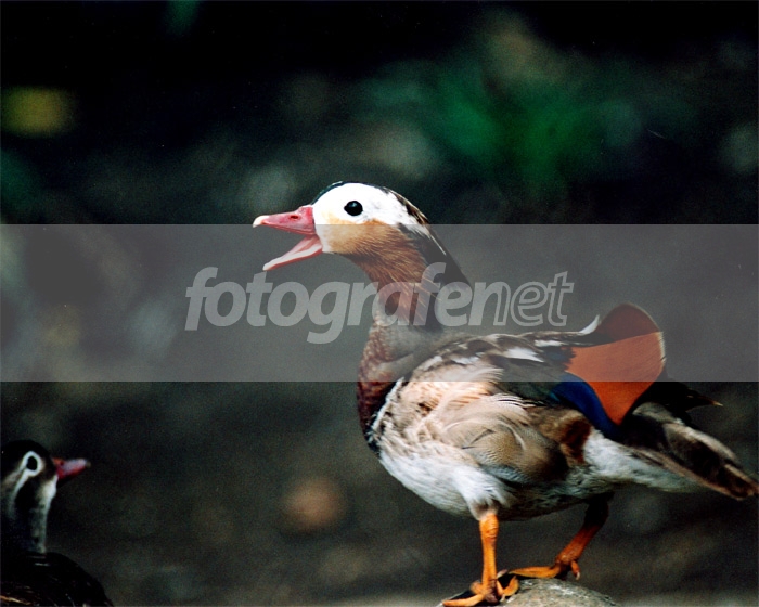 Aix galericulata, Mandarin duck. Jenis bebek yang bersarang dalam lubang pohon. POI agak soft dan bebek yng di kiri agakmengganggu. Saya suka latar belakangnya yang blur dan gelap. Dengan 105 mm? Apa bisa begitu dekat? Tidak pakai Tele-converter?