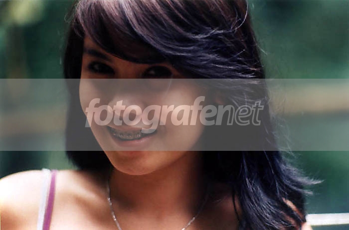 agak gelap di sekitar mata(padahal kalo menurut saya matanya cukup berbicara)... Coba cari penyinaran... Sinar yang pas (ini foto outdoor kan??!!) kepalanya kepotong terlalu bawah... saya lebih suka kalo vertikal bukan horisontal bahu kebawah kelihatan sedikit (biar lebih sensual.... Salam