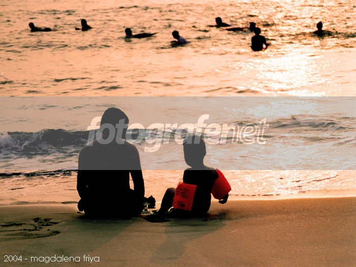 orange-nya sunset memang satu warna tersendiri yang menarik untuk dipandang, lagi pula sanset juga termasuk salah satu panorama yang sering di potret untuk landskape. tapi foto anda menonjolkan warna terjauh yang ada pada warna matahari dan itu satu keunikan buat saya. objek utama sangat kuat dan background foto anda juga mendukung objek foto anda. kontras warna pelampung pada tangan si keponakan sangat mendukung warna sunset yang terekam paling intens pada foto. but any way komposisi anda kuat, rasa pada foto anda juga hampir berbau kulit terbakar matahari dan asinnya air laut pantai carita. 3 TU untuk anda. bravo...