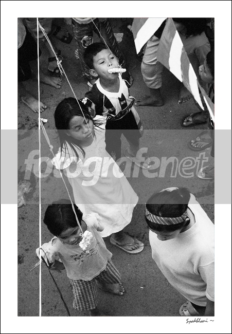 Anglenya dari pohon pinang ya?? :D Kok yg atas masih melahap krupuk tp yang lain udah berenti ya, lucu juga...BWnya apik, moment dan komposisinya menarik...salam!