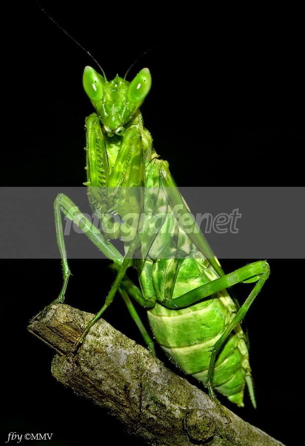 Date Time Original: 2005:08:27 10:12:53rnISO Speed Ratings: 200rnTheopropus elegans, Asian Boxer Mantis, semacam walangkadung/cangcorang/belalang sembah (Kalau walang kekek setahu saya ialah sejenis Walking Stick). Masih hasil hunting kemarin. Dengan flash Metz 40MZ-2 pada hotshoe dengan diffuser styrofoam yang akhirnya terbakar karena menempel pas di depan fresnel lens flashnya!. Perhatikan matanya yang selalu terlihat tidak focus (padahal yang di depan dan di belakang bidang matanya masuk focus). Efek yang mirip dengan mata belalang kayu. Yang tambah lucu ialah titik hitam yang mirip 'biji mata' pada compound eye/mata majemuknya. Ternyata titik ini bisa berpindah-pindah, betul-betul mirip biji mata. PS CS2 crop, shad/highl, burn, hue/sat, USM. (setelah diperhatikan lagi, hijaunya agak kurang pas. Ini karena berusaha menghilangkan dengan Hue warna kuning yang muncul ketika mulai diolah (padahal di RAW tidak kuning).
