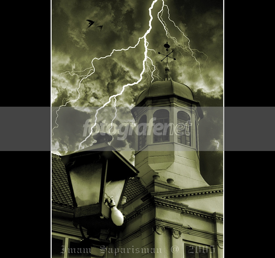 Foto Musieum Fatahillah di Jakarta Kota. Olah digital di PS, manipulasi awan dibuat dengan memakai filter difference clouds yang kemudian di burn dan di dodge ulang, halilintarnya memanfaatkan plugin filter lightning. colour diubah ke sepia dengan mengubah hue-saturationnya. agar gedung terlihat tua dinding dindingnya saya burn juga. penggabungan layer menggunakan tehnik musking. banyak cara lain editing melalui PS, mungkin teman teman mengetahui cara yang lainyang lebih simple.nsekalian bagi bagi ilmu, hehehe.ndemikian dari saya, semoga berkenan.