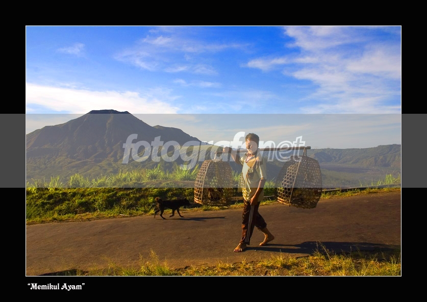 Seorang penduduk Kintamani memikul ayam untuk dicarikan sinar matahari. Mereka biasa memelihara ayam jago karena suaranya yg indah. BGnya Gunung Batur. Jalanan itu memang menurun. ISO 100.nMohon saran dan kritikannya...Thanks...nSalam dari Denpasar...