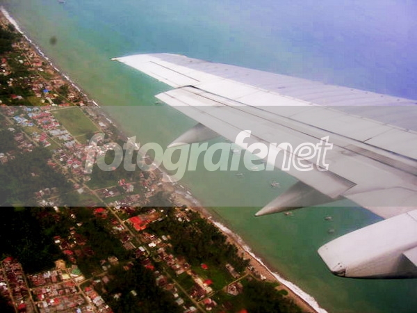 view yang indah..dipermanis dengan sayap yang menegaskan klo foto diambil dari ketinggian...yup cuma kaca yang tidak jernih mengakibatkan tone/warna di daerah perairan kurang bersih (mungkin bisa clone di daerah "yang bersih")..smoga berkenan