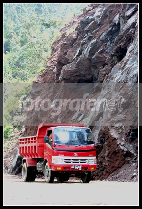 Momment-nya pas banget, truk persis di bawah batu gunung yang terlihat memang rawan longsor. Komposisi dan sudut pengambilannya cakep Pak PC..... Salam...