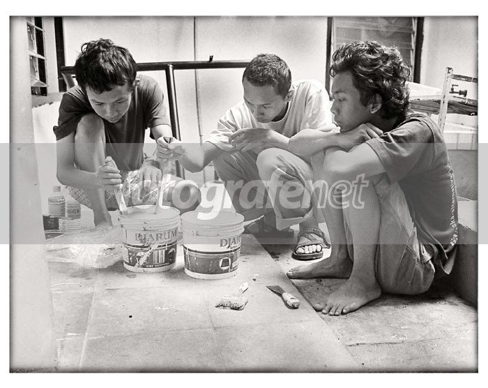 Bocah-bocah Batununggal, dari kiri ke kanan: Yana, Anggur, Aris.nMereka sedang ngecet rumah yang dikontrak bersama.