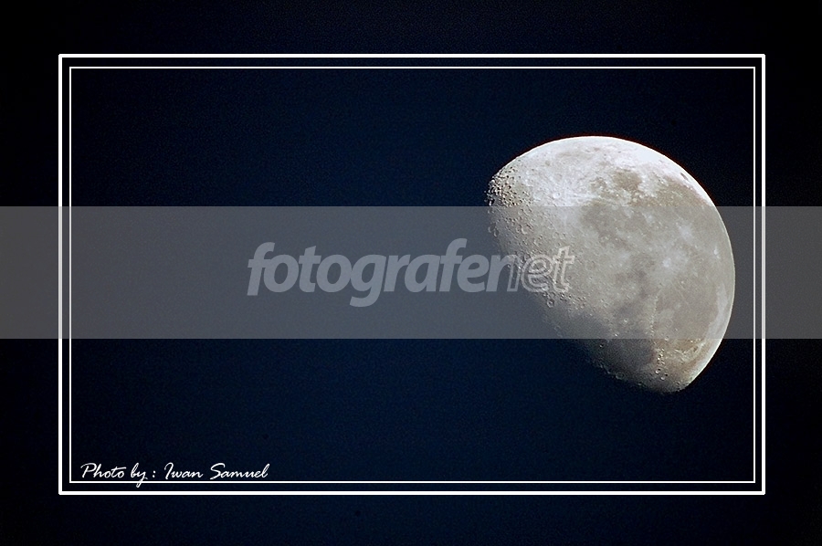 Date Time Original: 2006:10:12 05:48:52 rnrnKebetulan tadi pagi pas nyuci mobil .... nengok ke langit eh koq masih ada bulan ??? Wah pernah denger kalo pas sore hari atau pagi hari bulannya kalau difoto detilnya bisa muncul .... karena cahaya permukaan bulan tidak terlalu kontras dengan sekelilingnya .... langsung cuci mobil berhenti dan ambil kamera+TC 3x MF + Nikor AiS 300mm F4.5 .... jepret .... ternyata detilnya memang muncul.... jangan bosen yah... soalnya masih terobsesi untuk macro-in bulan ...he...he...he.... rnKomposisi sesuai foto asli ... tidak dicrop sama sekali ... hanya resize dan auto level, contrast dan colour (BG birunya jadi hitam)