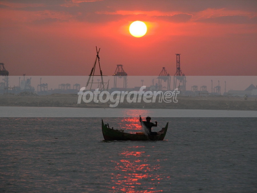wow...matahari dan langitnya menyatu dan indah....sayang horizon miring dan bambu segitiga malah lebih jelas dari nelayan.......IMHO, salam