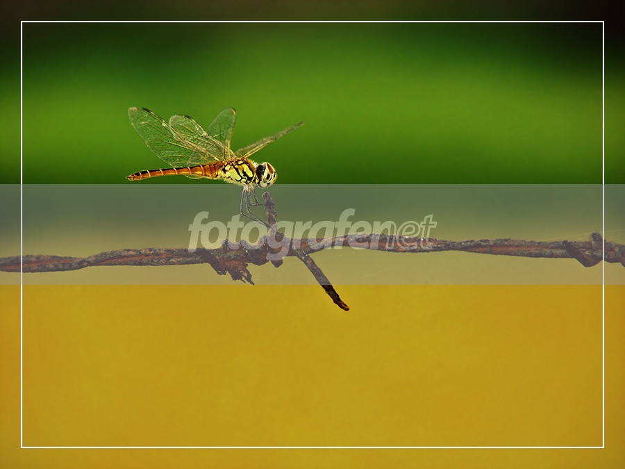 Belum bisa masuk kategori macro...rnKarena belum mencapai ukuran 1:1 lha apalagi ini kan masih jauh... :)rnSatu ekor capung dipotret utuh aja hampir tidak mungkin masuk kategori macro...rnrnNature juga bukan karena ada kawat durinya :)rnKategori satwa koq rasanya bukan juga ya... Jadi lain-lain aja dehrnrnTertarik ngeliat pola badan yang mirip capung hijau tapi ekornya orange...rnMungkin hasil asimilasi...rnBground bawah adalah padi yang mulai menguning... bground atas adalah hijau kebun kangkungrnrnC & C Welcome