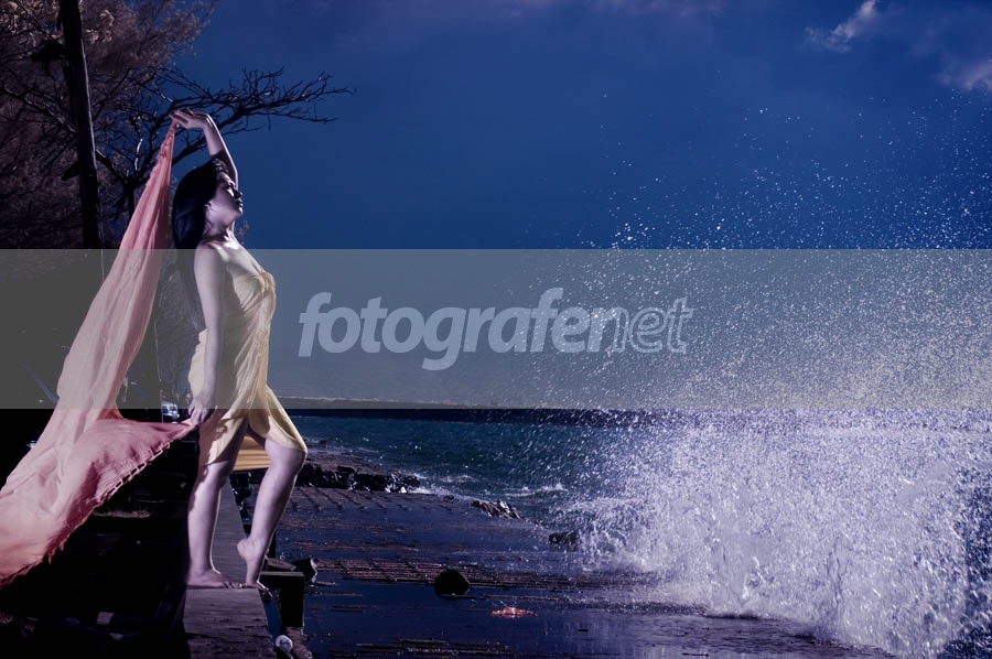 Asyik deh dapat moment deburan ombak yang atraktif. Mungkin kalau warna baju dan selendang dikontrasin untuk tidak ikut "bluish" akan lebih eye catching? Coba deh.