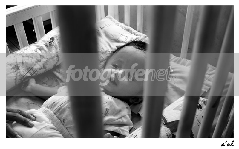 suka sekali foto ini... suka foto nya lho, bukan suka dgn keadaan anak yang kasihan ini :( Pengambilan foto di balik batang2 tempat tidur si anak sangat artistik, memberi kesan lebih kasihan...