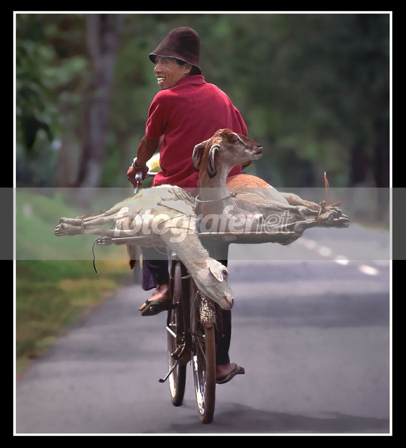 fotonya lucu.gemes ngeliatnya.apalagi pose kambingnya lucu gitu...trus abang penarik sepedanya juga pas ngelengos ke belakang.pake senyum pula membuat fotonya jadi lebih bercerita.menarik...