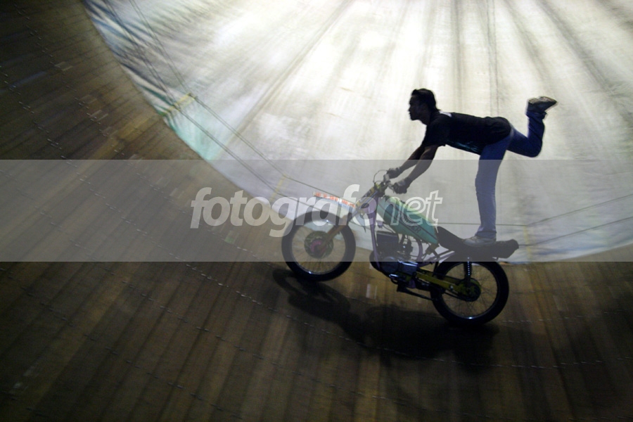 (Saya mahasiswa semester akhir di UNJ / Univ. Negeri Jakarta, Rawamangun, jurusan Seni Rupa, saya berkarya min. 15 karya foto jurnalistik dan akan dipamerkan (pameran Tugas Akhir) di UNJ di akhir Juli 2007, silahkan datang kepada anggota FN, gratis, dan ada berbagai media lain, seperti : lukis,tekstil, dll. dan saya mengambil Tugas Akhir "Tong Setan dalam karya fotografi", mohon Apresiasinya, terima kasih)nnSeorang Joki sedang mengambil gaya bebas di dalam arena tong setan, dia berusaha untuk memberikan hiburan dengan gaya atraksinya yang berbahaya.