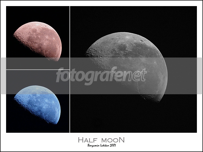 Bulan Separuh yang warna-warni. Warna-warni ini didapat dengan mengubah pilihan WB pada kamera. Warna ungu muncul kalo WB dipilih Fluorescene, warna biru muncul kalo diplih Tungsten. Bulan yang kelabu diperoleh dengan pilihan natural light yang kemudian didesaturasi untuk mempertegas hitam-putihnya.rnrnSemua foto dijepret pada 7 Juli 2007. sekitar jam 5 subuh. Handheld - tanpa tripod (!), karena posisi bulan agak tegak lurus (vertikal) ke atas (kira-kira sama dengan posisi matahari jam 1 siang).rnrnTriknya adalah saat ngambil foto saya berbaring di atas kap mobil dengan kepala dimantapkan kontak dengan permukaan kap mobil, sambil ngintip melalui view finder, kamera dirapatkan ke wajah....kepala saya berfungsi sebagai tripod....he33x......rnrnLensa yang saya gunakan sebetulnya masih pake nama Minolta, walaupun sekarang udah diambil alih oleh Sony. [Dipilihan lensa yang tersedia pada daftar FN sudah hanya Sony yang ada]