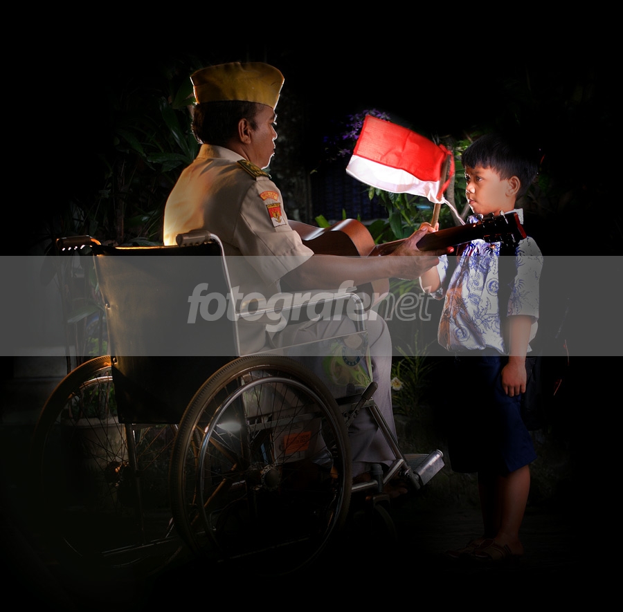 foto yang humanis sekali. cuman saya agak sedikit terkecoh dengan judulnya, nyanyian sunyi. biasanya, imho, kata "nyanyian" itu identik dengan bunyi2an suara yang keluar dari mulut kita. tapi di foto ini, saya melihat "nyanyian" lebih dikaitkan dengan adanya unsur gitar. bukankah gitar itu "berbunyi", bukan "bernyanyi"? mungkin, imho, kalo gitarnya terlihat senarnya putus sebagian, dan si cucu terlihat sedang menyanyikan lagu indonesia raya (karena biasanya lagu ini yang dinyanyikan ketika memegang bendera merah putih), mungkin akan lebih terasa efek "kesederhanaan" sang kakek pejuang veteran ini. imho loh pak. salam...
