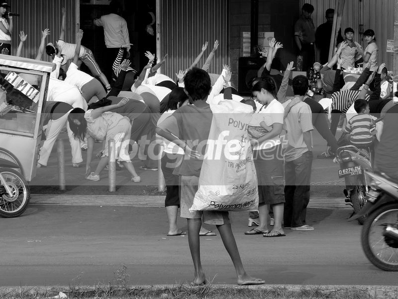Sunday morning, it is a time to do the exercisernYes, sport makes your body healty and fitrnMany people can do many exercise for the exercise such as jogging, cycling, and also the aerobicsrnUsually aerobics are performed by the woman, not many man do the aerobicsrnThis time I captured something interesting, a boy is looking at the aerobics in front of a supermarketrnHe is a trash collector and it seems he also likes the Aerobics