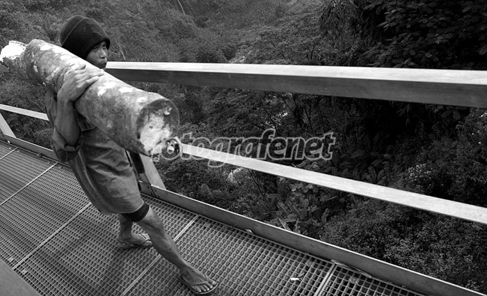 Jika dibidik dari sisi human interest, objek yang Anda foto sebenarnya sangat punya kekuatan. Apa yang ingin Anda tonjolkan (POI) dalam foto ini buat saya masih lum jelas. Si bapak yang memikul kayu? atau kedalaman jurang? atau perpaduan keduanya? Trus si bapak rada senyum, jadi kurang natural aja buat saya. So, peace n salam jepret selalu.