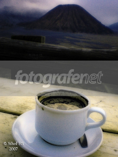 kopinya nikmat nie!tulisan dipagar agak mengganggu ya kak,meski samar!!overall nice banget fotonya..view bromo jadi dingin2hangat..