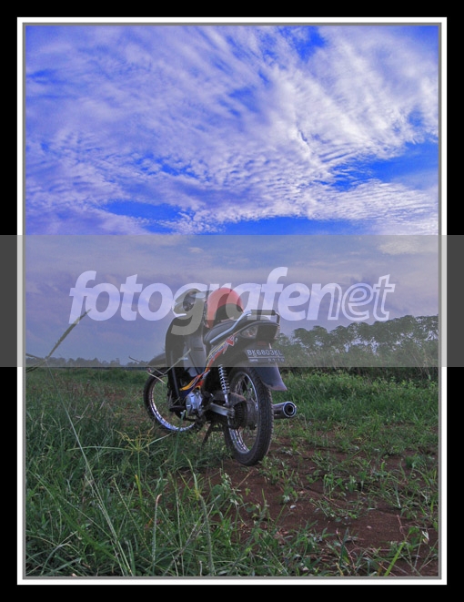 bg awan bersisik ok...sebuah moment yang bagus, sudut ambil POI (sepeda motor) akan lebih baik lebih rendah sehingga kesan dramatis akan lebih kuiat...helm di atas bisa jadi POI yang menarik..tapi bisa juga jadi pengganggu...tapi baikknya tidak ada helm saja...supaya poinya lebih sederhana....