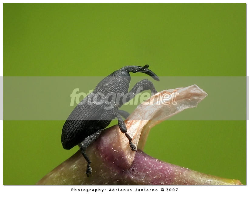 masih hasil dari ngobrak-abrik halaman rumah mbak Tari...rnrnkumbang weevil hitam ini sedang berada di tangkai bunga anggrek, ukurannya kecil sekitar 3-5mm mempunyai semacam hidung yg panjang sehingga sering disebut kutu gajahrnrnterima kasih udah sudi mampir, jadi sekalian aja dibantai...rnrnsalamrn