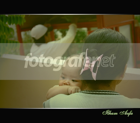 Anak gue lagi digendong sama si mbok lagi nungguin mi ayam matang.