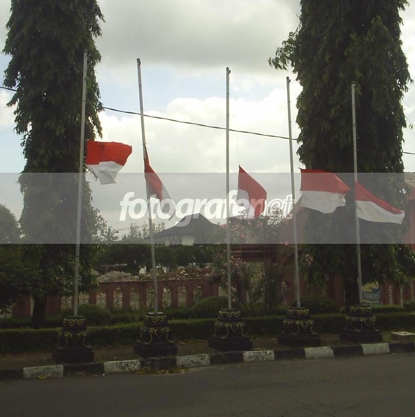 Bendera Setengah Tiang ini dikibarkan dalam rangka hari berkabung nasional setelah meninggalnya Pak Harto. Tapi sayang cuacanya tidak mendukung alias Mendung. Foto ini diambil di depan GOR Among Raga yang sudah rata dengan tanah (lihat foto pertama saya)