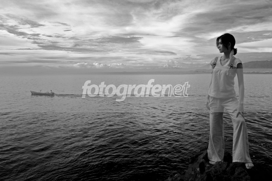 Suka sama komposisinya. Pas. Horisonnya dapet. Ada perahunya pula :D sayang dicuekin ama si model ;)) Olahan tonal BWnya apik. Nice shot. Thanks for sharing. Salam -uBeh-