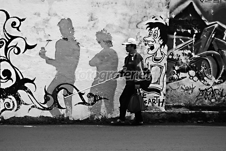 bidang gelap tembok mural sebelah kanan mengganggu, crop aja mas, sekalian memberi ruang agar orang tersebut tdk berkesan dead centre. kurang sabar menanti subyek yg nggak pakai topi n gondrong supaya nyambung dg bayangannya pasti lebih siip ! jangan lupa kunci "mf" nya