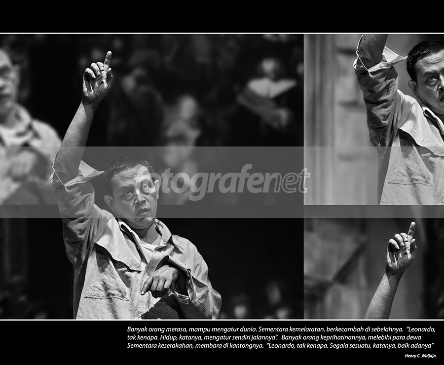 24 Januari 2008, 20:40. Martin adalah salah satu pasien lembaga syaraf. Ia mampu belajar dengan sangat cepat dan mampu meniru banyak hal dengan persis. Potensi "Leonardo Da Vinci" baru ini, begitu julukannya, menarik para ahli, termasuk milter dan politisi, pasang aksinnBudi Ros menyajikan seni akting yang piawai dalam menghidupkan sang Leonardo, yang menjadi tokoh sentral dalam pentas Teater Koma “Kenapa Leonardoâ€, karya: Evald Flisar, Slovenia, yang disutradarai oleh N. RiantiarnonnAku berusaha menyiratkan disorentasi sang tokoh dengan mendistrosi fokus perhatian dengan membelah-belah foto ini. Dan seperti karya lainku, untaian rasa kusandingkan