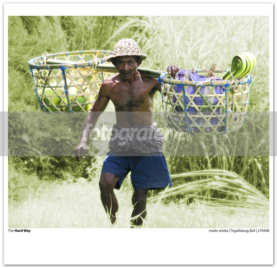 nice human,. Memang keras hidup ini, mari kita contoh bapak dalam foto ini , biar tua terus berjuang.. walau dg alat yg sederhana(2 keranjang&sebilah kayu) bapak ini membawa hasil kebunnya dg penuh semangat!! NICE SHOT sebuah foto yg bercerita.. gd moment>salam